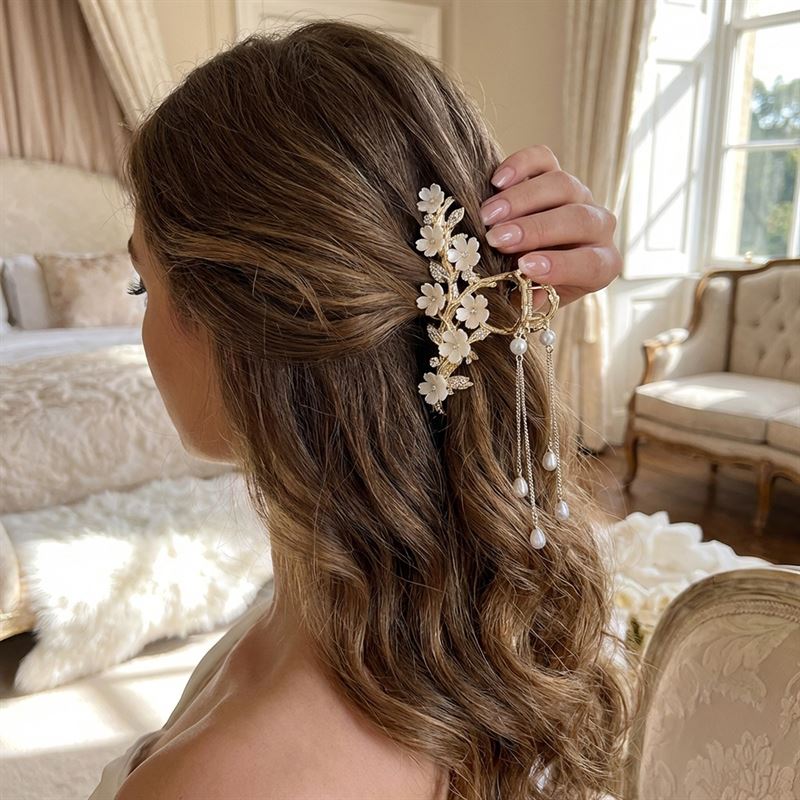 En exklusiv och förföriskt hårsmycke tillverkat av metall. Berikad med förtrollande blommor och glittrande strass-stenar. Denna hårklämma är en exakt representation av elegans och unikhet. Jasmin är skapad för att förvandla varje hårarrangemang till en förfinad och festlig framtoning. Oavsett om det är en vanlig vardagsfrisyr eller en speciell tillställning, är denna betagande hårklämma designad för att förvandla och förnya din look. Framhäv din stil och lägg till en sublim touch till varje fest, ceremoni, födelsedag, semester eller fotosession genom att låta Jasmin vara din ultimata stiluttryck.
