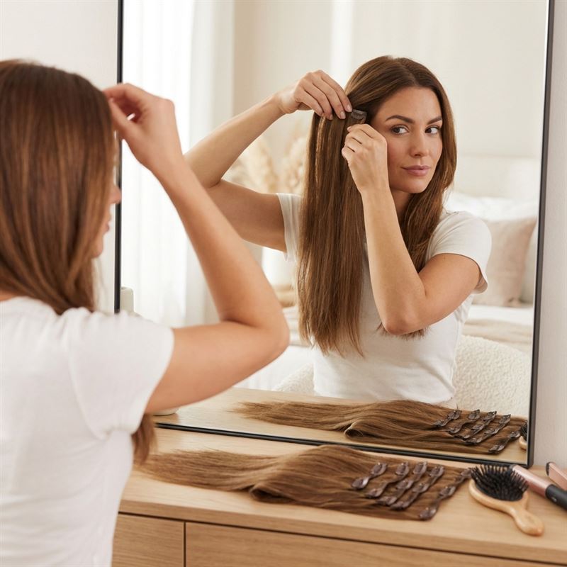 Med sju banor av högkvalitativt Remy-hår, där alla hårstrånn och fjällskikt vänder åt samma håll, smälter dessa extensions in sömlöst med ditt eget hår och motverkar trassel. De är enkla att fästa och ta bort med clips, och är dessutom skonsamma mot håret. Du kan styla dem precis som ditt eget hår – de kan slätas ut, lockas och permanentas för att passa din önskade look.