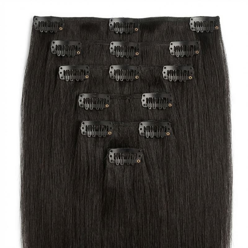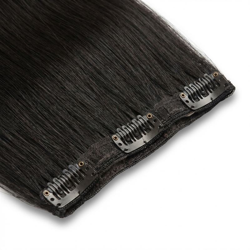 Dessa Clip On Extensions i 40 cm längd och färgen #1B Naturligt svart är din snabba väg till ett fylligare och längre hår. Tillverkade av 100% äkta Remy-hår, ger de ett naturligt utseende och en smidig integration med ditt eget hår.