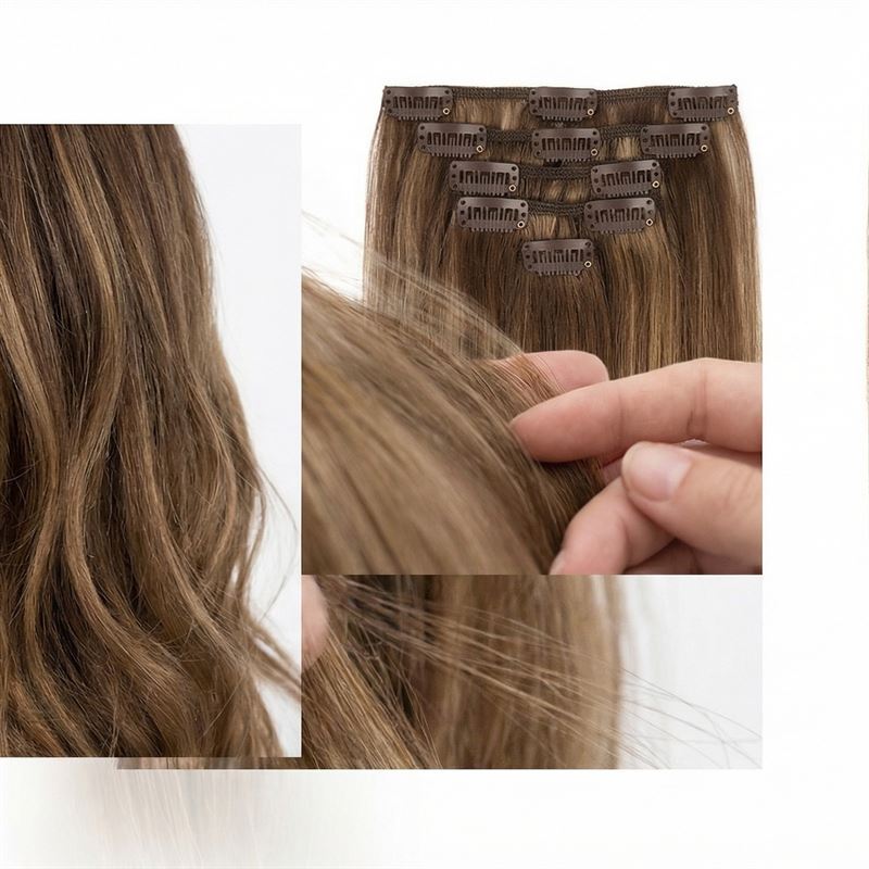 Dessa Clip-on extensions är tillverkade av 100% äkta Remy-hår och kommer i en vacker Mix mörkblond 4/27# nyans. De ger dig möjlighet att snabbt och enkelt förlänga och fylla ut ditt hår för en fylligare look.