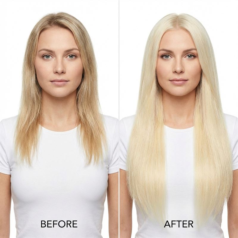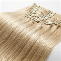 50 CM CLIP-ON HAIR EXTENSIONS 60# PLATINABLOND CLIP-ON SET - HAIR EXTENSIONS Med vårt clip-on set får du långt hår på bara 5 minuter. Håret är 100 procent äkta löshår i remy-kvalitet, vilket innebär att alla hårstrån är vända åt samma håll – precis som ditt eget hår. Detta gör att dina extensions varar längre och håller en bra kvalitet i lång tid framöver. Du fäster enkelt löshåret med de påsydda clipsen och tar ut dem när det passar dig. Du kan använda setet till en hårförlängning, till att göra det fylligare eller för att få färgkontraster. Vi rekommenderar ett paket Clip-On Hair Extensions till dig som har tunt hår eller till dig som bara vill få ett fylligare resultat. Har du normalt-tjockt hår rekommenderar vi två paket.