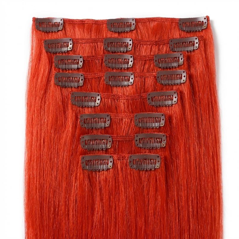 50 CM CLIP-ON HAIR EXTENSIONS KLARRÖD CLIP-ON SET - HAIR EXTENSIONS Med vårt clip-on set får du långt hår på bara 5 minuter. Håret är 100 procent äkta löshår i remy-kvalitet, vilket innebär att alla hårstrån är vända åt samma håll – precis som ditt eget hår. Detta gör att dina extensions varar längre och håller en bra kvalitet i lång tid framöver. Du fäster enkelt löshåret med de påsydda clipsen och tar ut dem när det passar dig. Du kan använda setet till en hårförlängning, till att göra det fylligare eller för att få färgkontraster. Vi rekommenderar ett paket Clip-On Hair Extensions till dig som har tunt hår eller till dig som bara vill få ett fylligare resultat. Har du normalt-tjockt hår rekommenderar vi två paket.