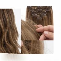 Ett paket FashionGirls Clip-On Hair Extensions fördelat på sju bitar. Bitarna är av olika bredd så att du enkelt kan variera och anpassa dina extensions efter just din frisyr.