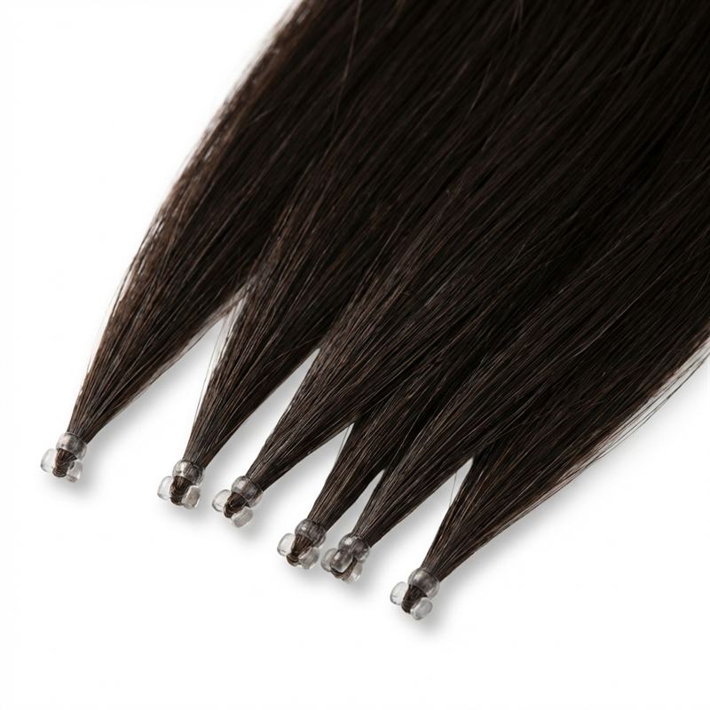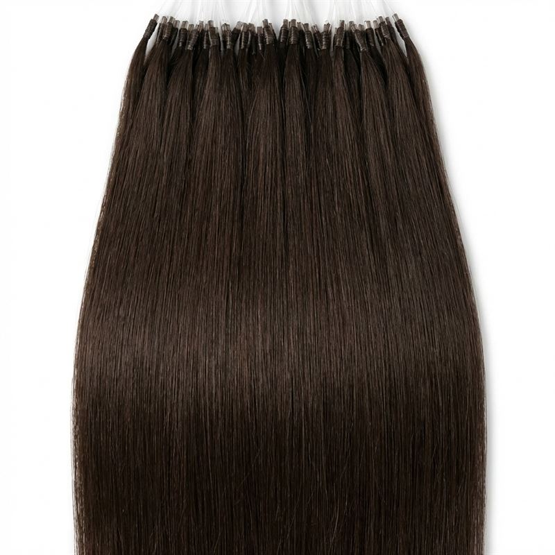 Dessa Cold Fusion extensions i 50 cm längd och nyansen Mörkbrun 2# är tillverkade av 100% äkta Remy-hår. De fästs med mikroringar, en skonsam metod som varken kräver lim, tejp eller värme, vilket minimerar slitage på ditt naturliga hår.