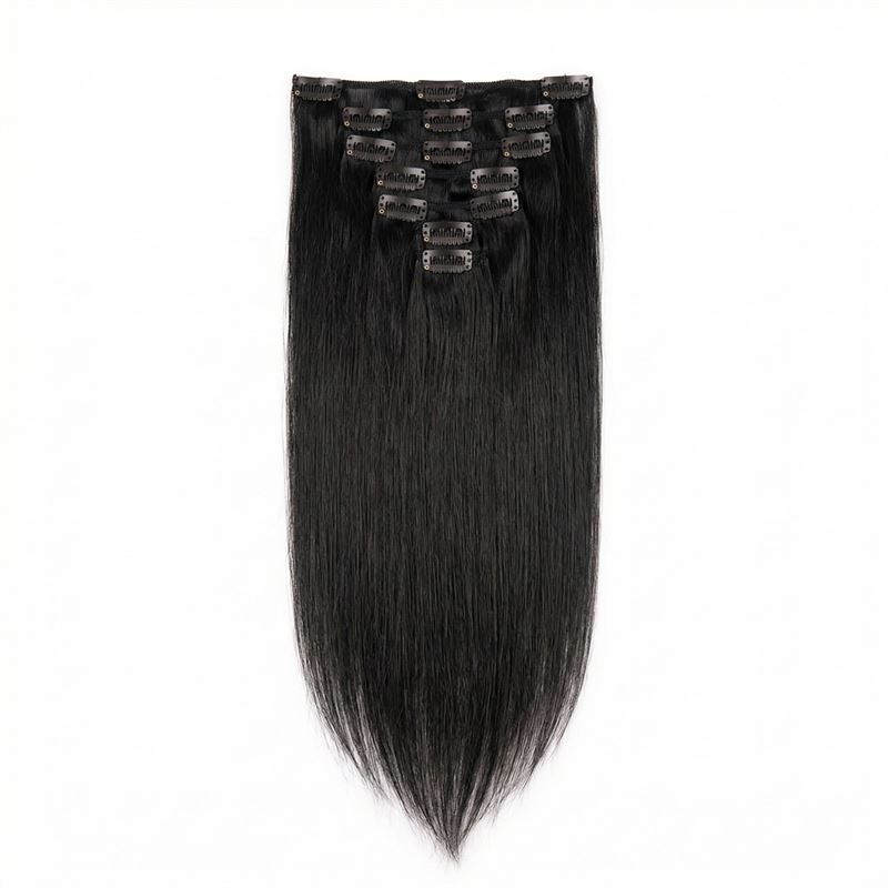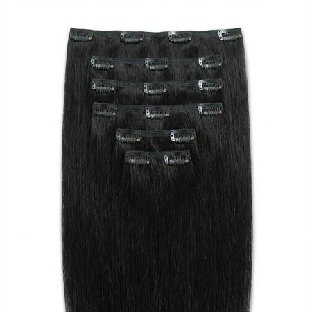 Detta kompletta set består av 7 delar i en naturtrogen syntetisk kvalitet med en vacker naturlig glans. Håret är i färgen Svart #1 och kan stylas med värme upp till 180 grader, vilket ger dig flexibilitet att skapa olika frisyrer. Med totalt 17 clips fördelade på olika bredder fästs extensionsen säkert och diskret i ditt eget hår, perfekt för både vardag och fest.