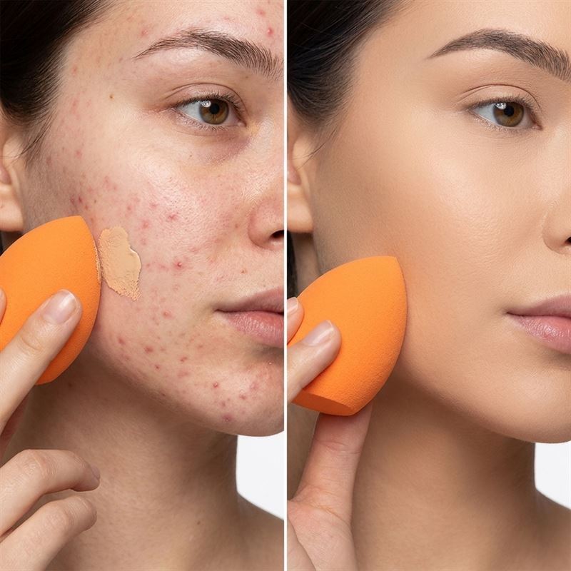 Den unika komplexa formen gör det enkelt att nå alla delar av ansiktet. Använd den spetsiga änden för att applicera makeup runt ögon, mun och näsa, medan den breda änden är idealisk för större ansiktsområden. Svampen är designad för att sömlöst blanda ut både flytande och krämfoundation, vilket ger en jämn och retuscherad finish utan synliga porer.