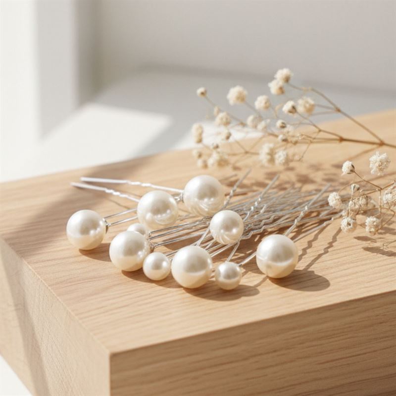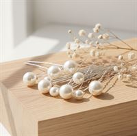 De silverfärgade nålarna kombinerade med klassiska, vita pärlor skapar ett tidlöst och feminint uttryck som passar perfekt till både vardag, fest, bröllop och andra speciella tillfällen. Använd dem enskilt för en minimalistisk look, eller mixa flera storlekar för en mer romantisk och exklusiv styling.