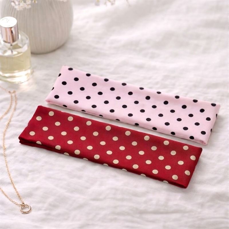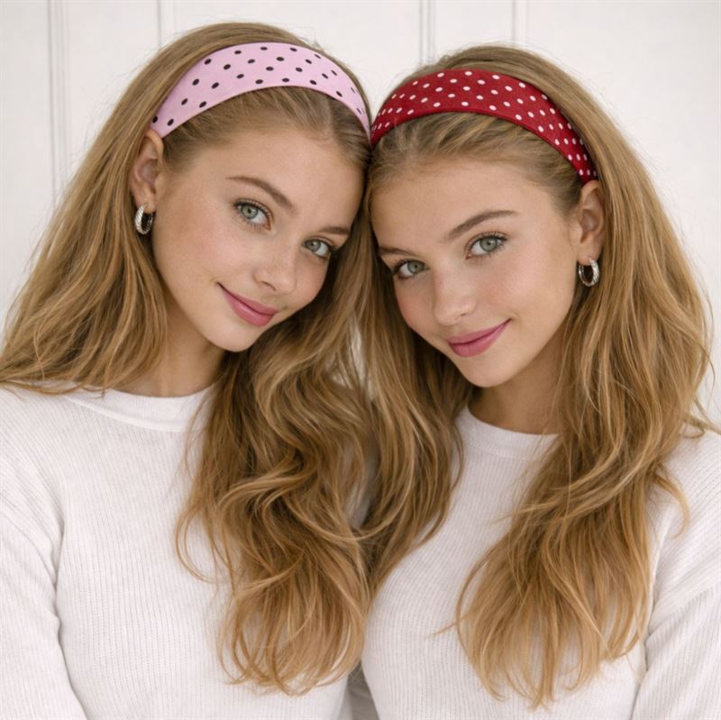 I setet får du ett rosa hårband med svarta prickar och ett rött hårband med vita prickar, så att du enkelt kan variera din look efter outfit, humör och tillfälle. Använd dem till utsläppt hår, hästsvans, knut eller half-up-frisyrer när du vill ha en enkel styling med lite extra personlighet.