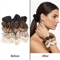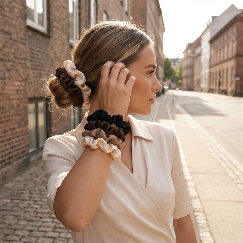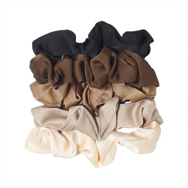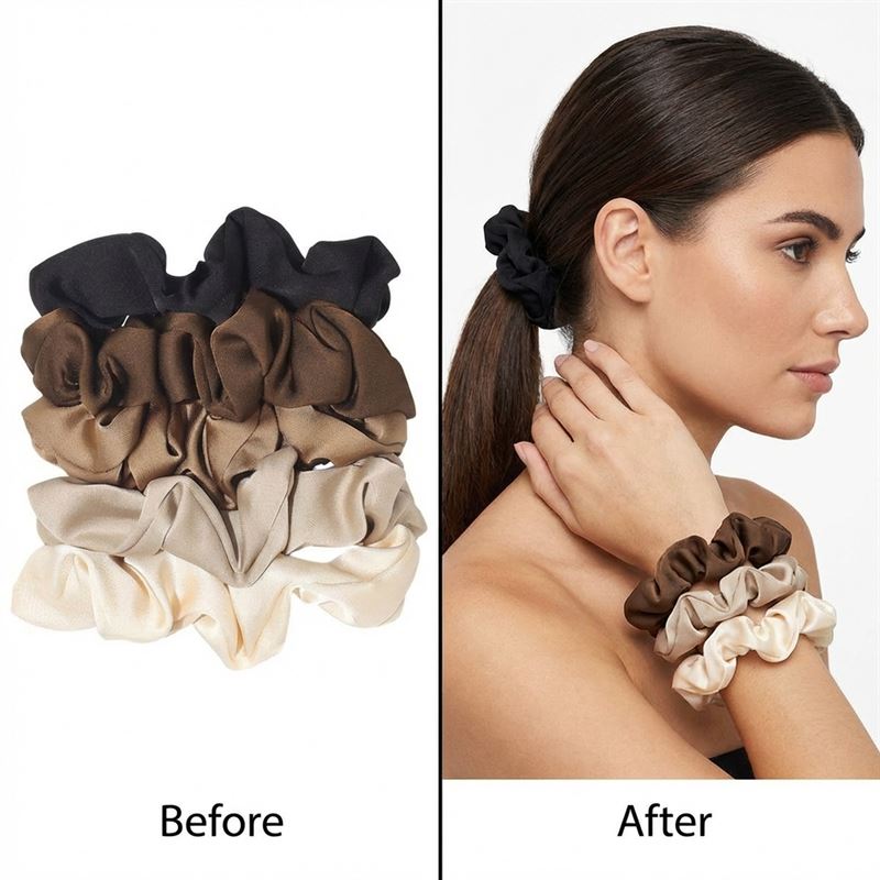 Detta set inkluderar 5 lyxiga satin scrunchies i sofistikerade nyanser av svart, brun och beige, designade för att komplettera vilken outfit som helst med stil. Inte bara perfekta för att försiktigt samla håret, dessa mångsidiga scrunchies kan också bäras som stiliga armband runt handleden, så du alltid är förberedd med en hårband. Upplev den perfekta fusionen av funktionalitet och mode med detta vackra set.