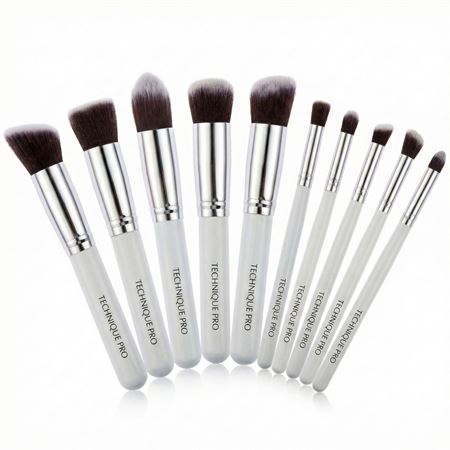 Fantastiskt set sminkborstar från Technique Pro som innehåller 5 kabuki-borstar och 5 precisions-borstar. De klassiska borstarna har tätt packade, syntetiska hår av hög kvalitet. Skaftet är vit och har en snygg silverfinish (Silver Edition)