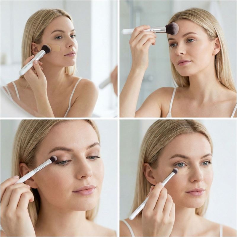 • Platt, vinklad pensel till applicering av concealer, speciellt bra till precis applicering omkring näsa och öga.