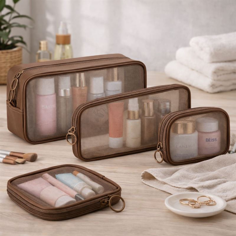 De fina meshpanelerna ger en snabb överblick över innehållet, så att du slipper leta efter dina produkter när du är på språng. Det gör setet idealiskt både som necessär, kosmetikväska, sminkväska, resväska och organizer i resväskan, för weekendresan, semestern eller daglig förvaring hemma.
