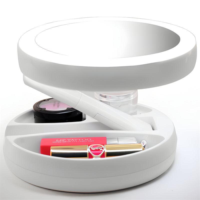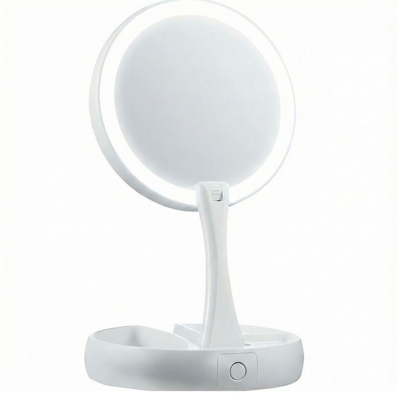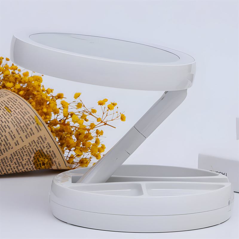 UNIQ Hopfällbar Sminkspegel med LED – Dubbelsidig 1x/10x Förstoring + 3 Förvaringsfack (Vit)