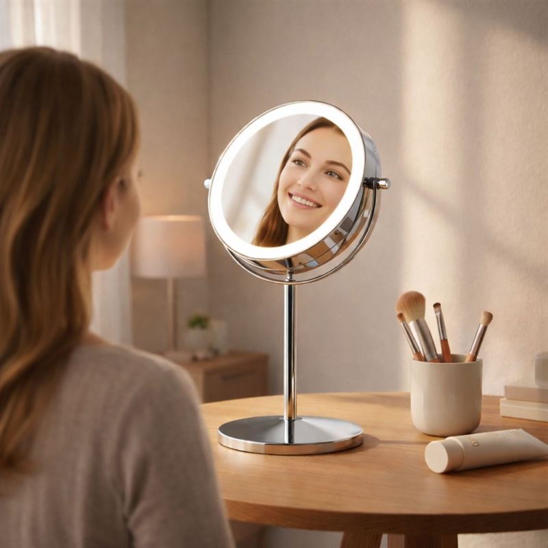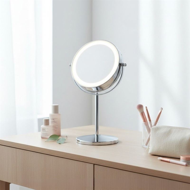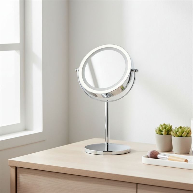 UNIQ Sminkspegel med LED-ljus är en stor och elegant kosmetikspegel med kromfinish, designad för att ge optimal beljusning och precision vid din makeup-rutin.
